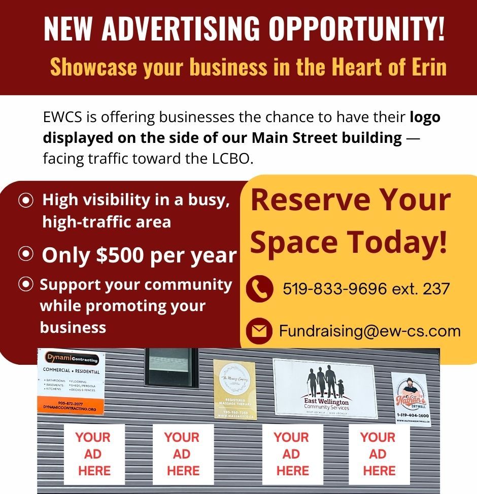 East Wellington Community Services offers unique advertising opportunities that not only promote your brand but also directly support vital programs and services in the East Wellington community. By advertising with us, your business will be seen as a proud community partner helping to make a difference in the lives of local residents.