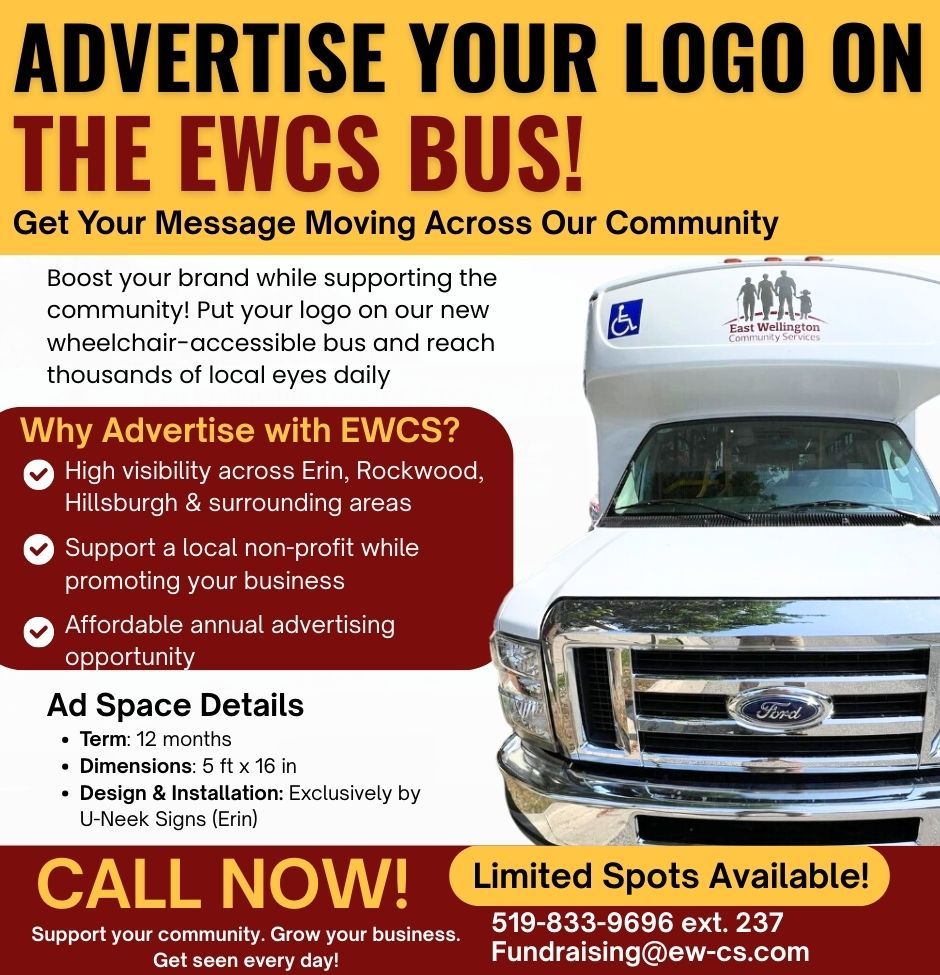 Our wheelchair-accessible transportation bus is on the road daily—driving through Erin, Rockwood, Hillsburgh, and beyond. With a large and eye-catching space for your ad, your business will be seen by community members every single day